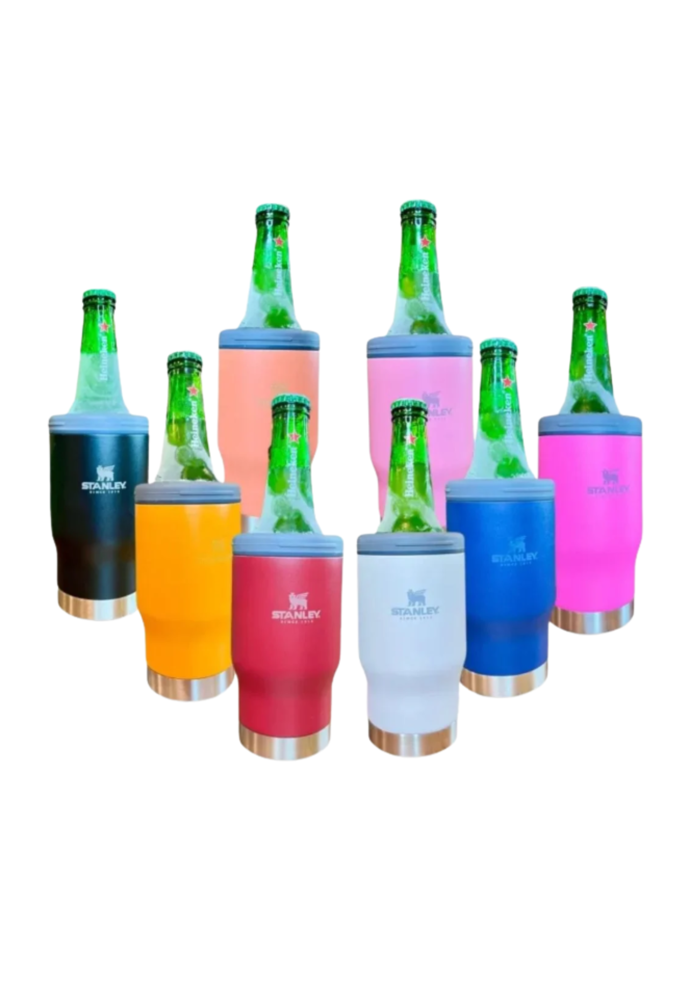 PORTA CERVEJA STANLEY 420ML, COM DUAS TAMPAS E ABRIDOR EM BAIXO, CONFERIR CORES, IMAGEM ILUSTRATIVA.